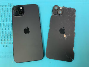 iPhone15Plusの修理です。背面ガラスが割れてしまったとの症状でしたが、バックガラスパネル交換で無事に復旧!