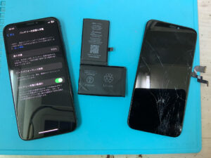iPhoneXの修理です。画面割れ&バッテリー劣化との症状でしたが、部品交換で無事に復旧!