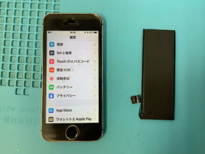 iPhoneSEの修理です。バッテリーの持ちが悪いとの症状でしたが、バッテリー交換で無事に復旧!