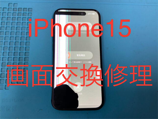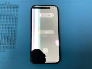 iPhone15の修理です。画面割れで正常に映らないとの症状でしたが、画面交換で無事に復旧!