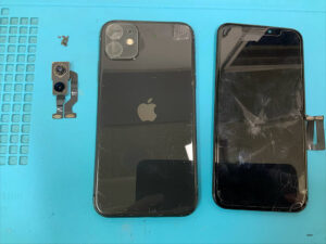 iPhone11の修理です。画面割れ&背面カメラレンズガラス割れ&リアカメラくもりとの症状でしたが、部品交換で無事に復旧!