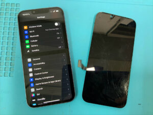 iPhone14の修理です。画面割れで正常に映らないとの症状でしたが、画面交換で無事に復旧!