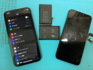 iPhoneXの修理です。映らない&バッテリー劣化との症状でしたが、部品交換で無事に復旧!