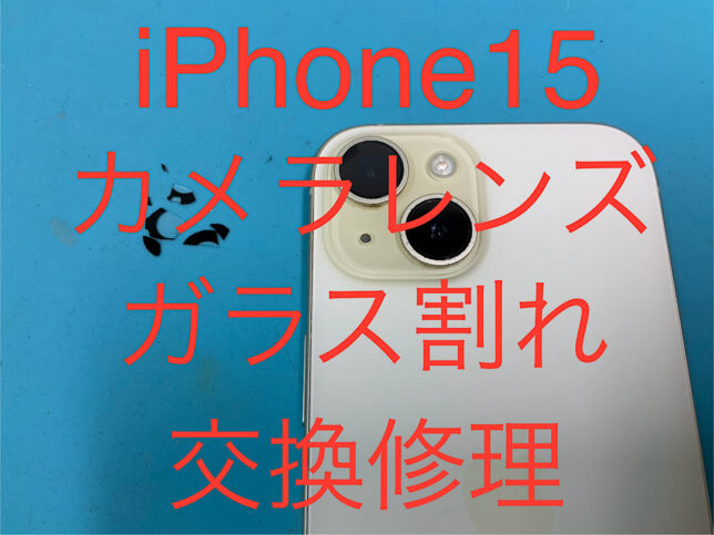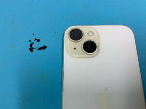 iPhone15の修理です。背面カメラレンズガラスが割れてしまったとの症状でしたが、レンズガラス交換で無事に復旧!