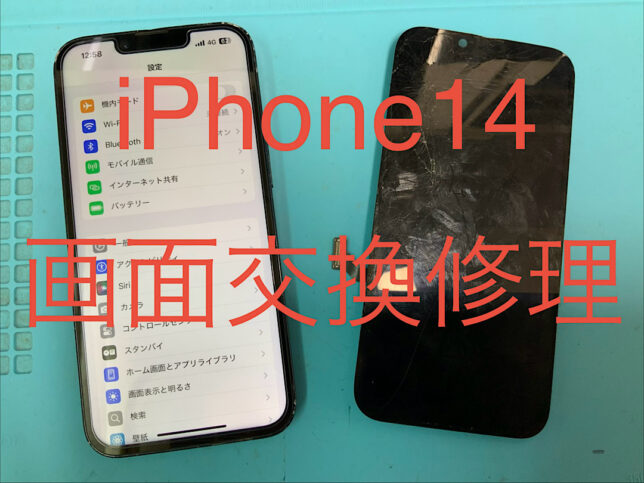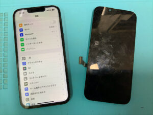iPhone14の修理です。画面割れで正常に映らないとの症状でしたが、画面交換で無事に復旧!
