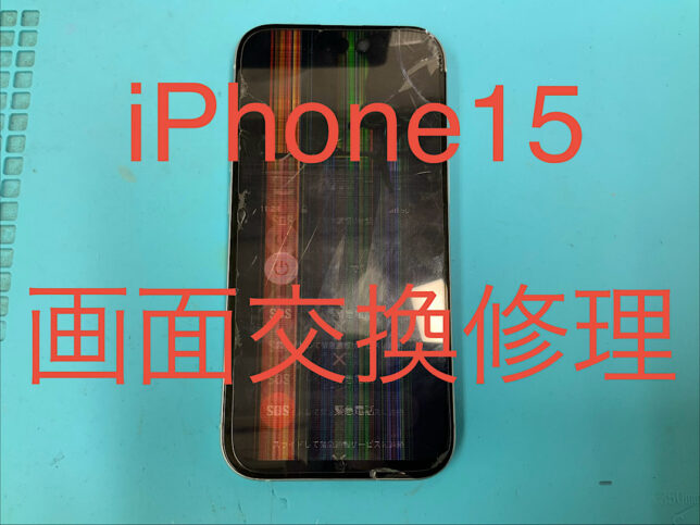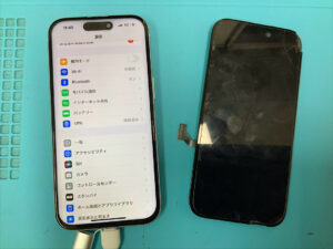 iPhone15の修理です。画面割れで正常に映らないとの症状でしたが、画面交換で無事に復旧!