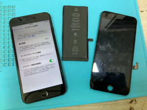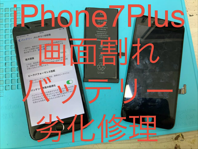 iPhone7Plusの修理です。画面割れ&バッテリー劣化との症状でしたが、部品交換で無事に復旧!