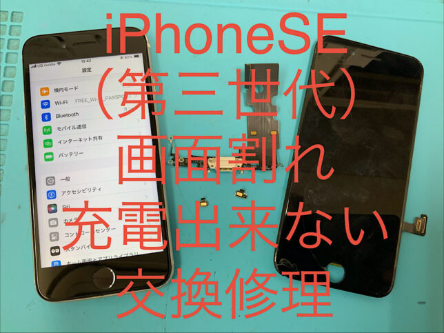 iPhoneSE3の修理です。画面割れ&充電不良との症状でしたが、部品交換で無事に復旧!